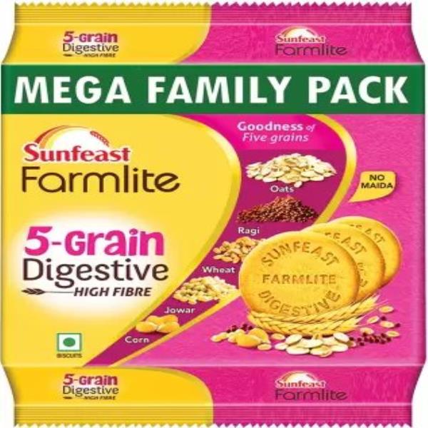 Here's a tasty way to power through the day. The Sunfeast Farmlite 5 Grain Digestive Biscuit is a High Fibre biscuit that'll give you the power to seize the day. It is made with the goodness of five grains like Ragi, Oats, Jowar, Corn and Wheat. These five super grains will keep you energised to live a multitasking life. Rich in fibre,Sunfeast Farmlite 5 Grain Digestive Biscuit is not just any digestive, it's Digestive and takes care of all your dietary requirements to keep you active to complete all your day's tasks. Made with the best quality ingredients that are sourced from the choicest farms in India. They contain no maida and are made using Aashirvaad atta and the goodness of those 5 grains. Baked to that perfect golden-brown crunch, these biscuits are not only good for you but also taste amazing. Pair it with your tea and you are in for a treat. So, add this delicious biscuit to your tea-time routine and take a bite of some crunchy goodness every day.�