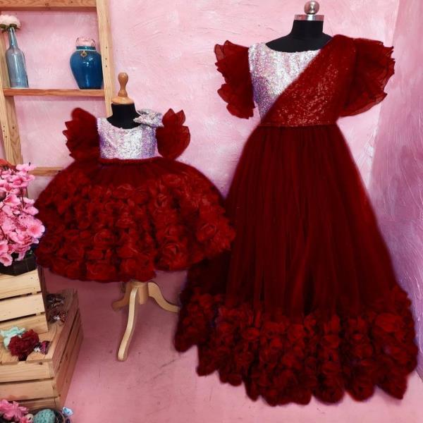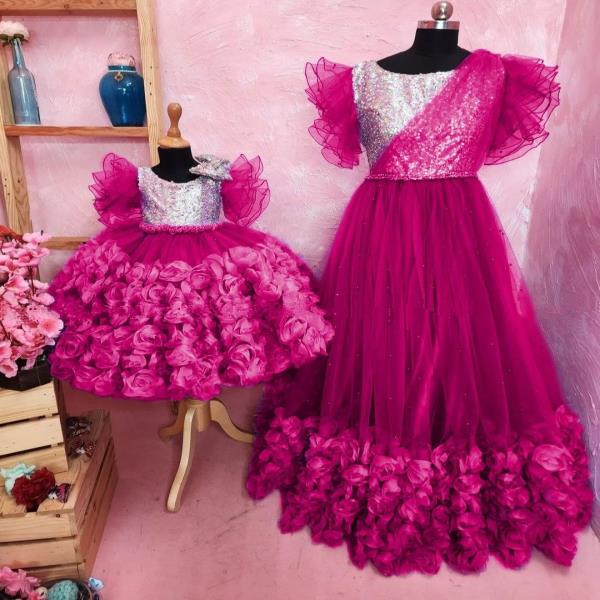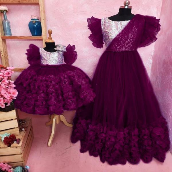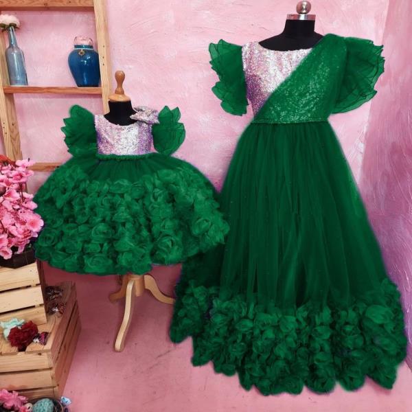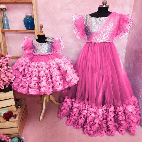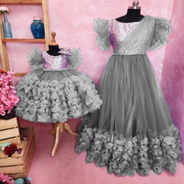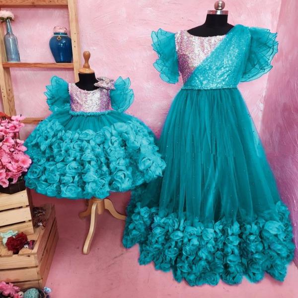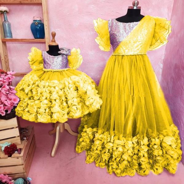 DAUGHTER Soft Tissue Net With Heavy Petal Work front and back side allover and Embroidery sequence work full ambrella flair With Frill Work (fully Stitched) Designer Shoulders Pattern