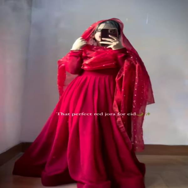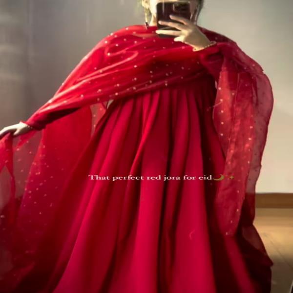 GOWN FABRIC: FOX GEORGETTE & DESIGNED WITH FANCY NACK PATTERN AND FULL CHUDIDAAR SLEEVES (FULL STITCHED) WITH HEAVY 5 MTR FULL FLAIR AND FANCY BACK PATTERN WITH DORI AND TASSELS